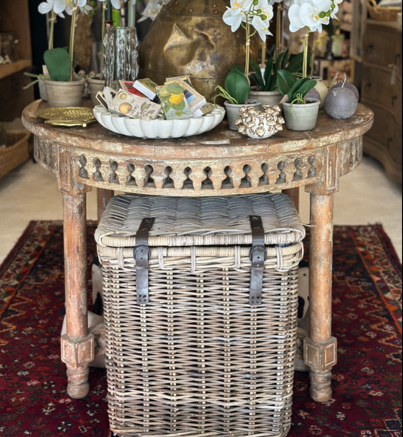 The Apecchio Table is an authentic vintage piece featuring beautifully intricate hand carved edging and its original aged patina.