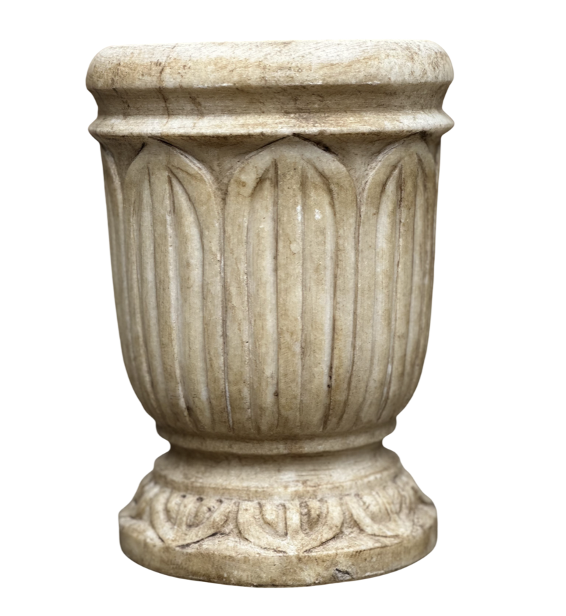 This striking marble vase showcases exquisite hand-carved craftsmanship, with each piece revealing the natural veining and subtle colour variations unique to the stone.